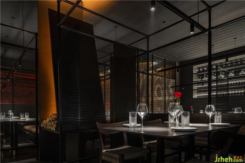 餐廳內(nèi)被黑色鋼網(wǎng)分割出一個個小空間,遮蔽視線,保護隱私,但因為鋼網(wǎng)的透氣感,并不顯得沉悶壓抑,搭配柔和的燈光,反而像是披上黑色薄紗般,朦朦朧朧,欲遮還羞。