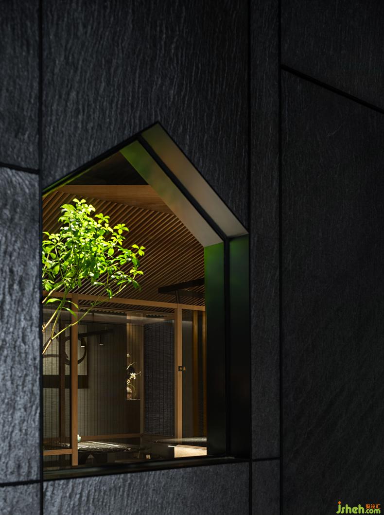 入口處的巖石薄板純粹質(zhì)樸的質(zhì)感呈現(xiàn)出一種靜謐之美,透過一個小屋形狀的窗口,隱約可見刺身臺廚師細致的工作狀態(tài)。