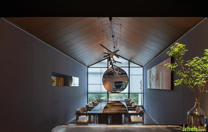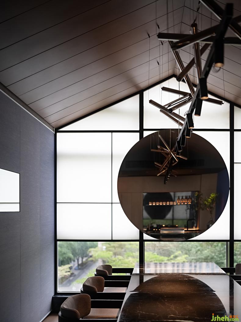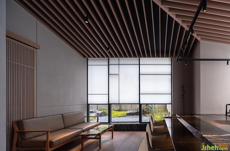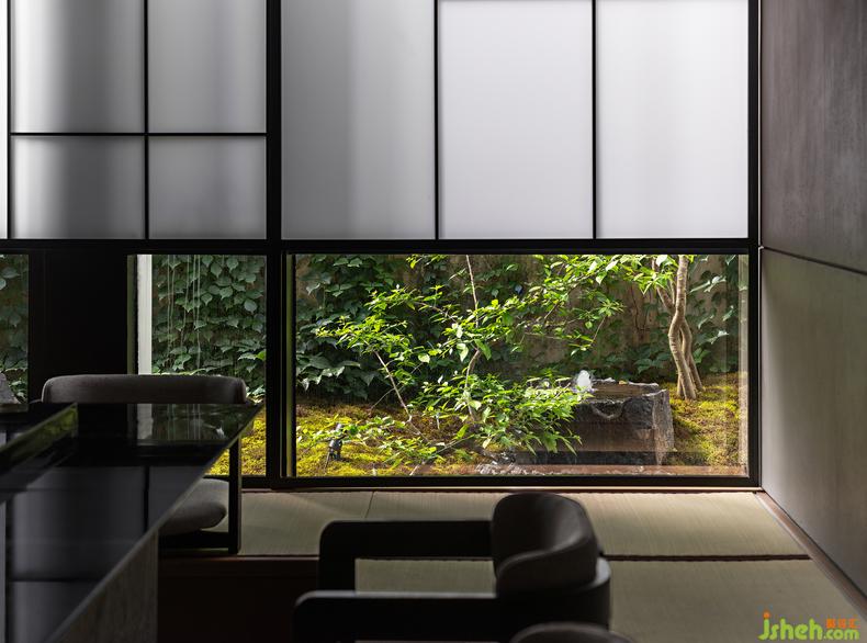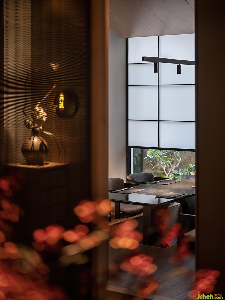 這一間日料餐廳設計最大的房在建筑的邊角,兩面窗,一面正對庭院,另一面可見街道的樹梢。