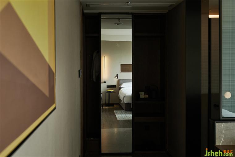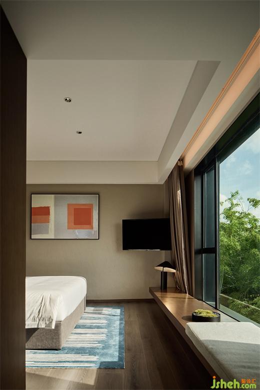 32平米房型橫臥于河岸,三亞小酒店設(shè)計把休息區(qū)和衛(wèi)生間分別設(shè)置于入門兩側(cè)。