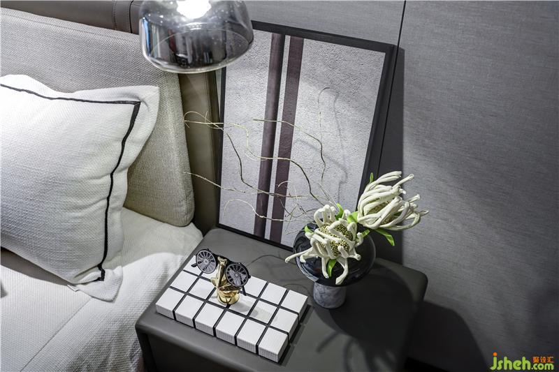 樓上的臥室也延續(xù)了整體的高級灰色調(diào),用金屬色作點綴