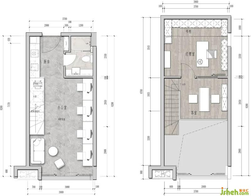 一層為員工辦公區(qū),二層為總經(jīng)理辦公區(qū)與休閑區(qū)