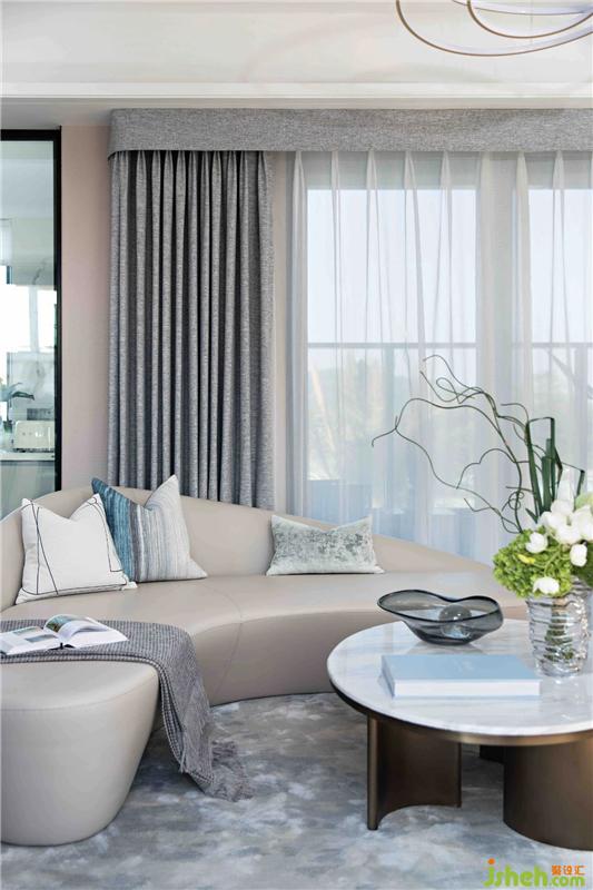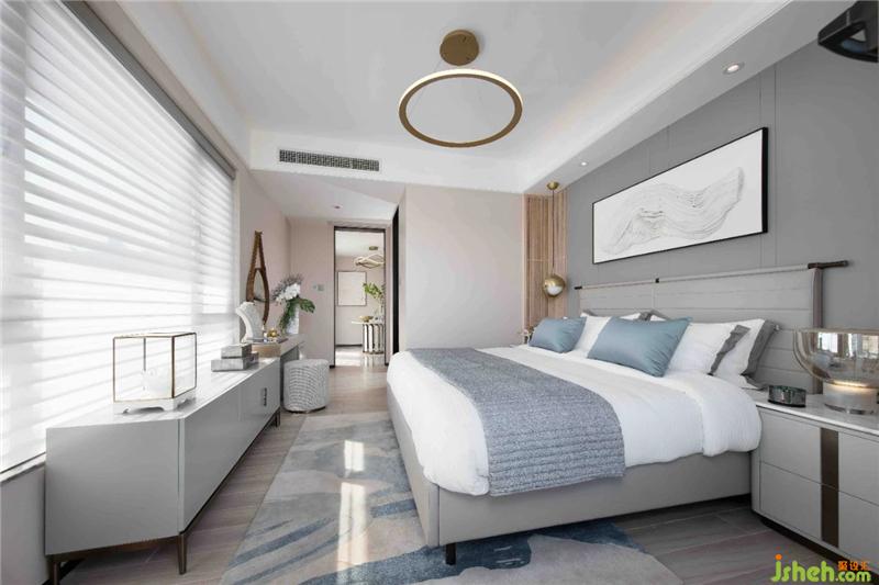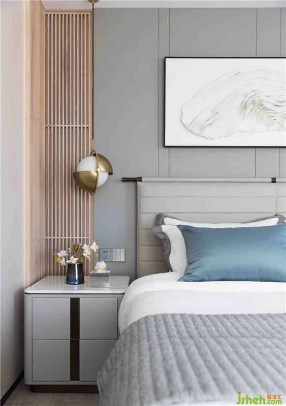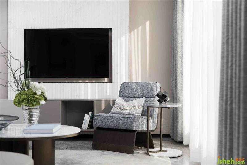 不同層次高級(jí)灰的色彩運(yùn)用,結(jié)合細(xì)致的幾何縱向線條,鋪排出極具現(xiàn)代感的美學(xué)風(fēng)尚,黃銅質(zhì)感的金屬飾品勾連起空間的藝術(shù)想象。