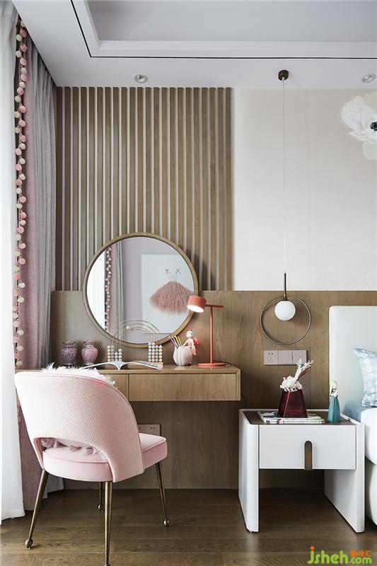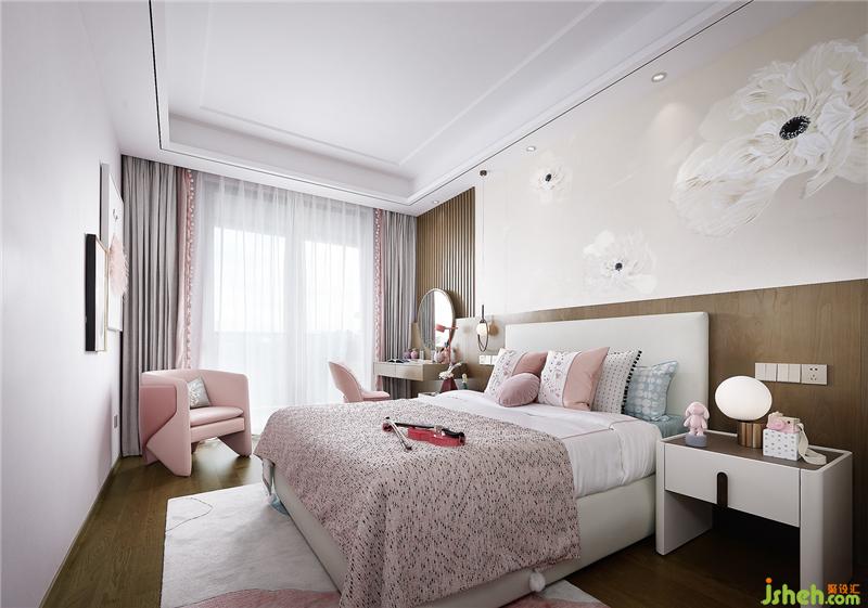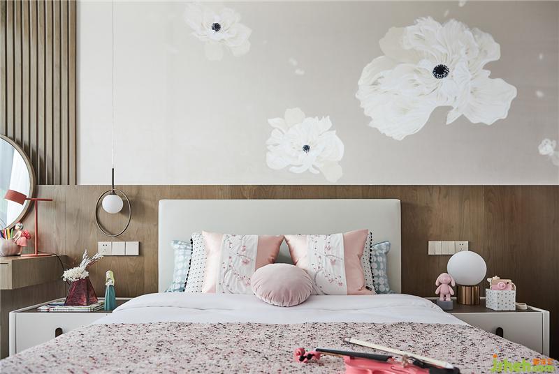 少女粉與清新白搭配出甜蜜夢(mèng)幻也不失高級(jí)質(zhì)感的女兒房,花朵蔓延的背景墻與抱枕浪漫十足