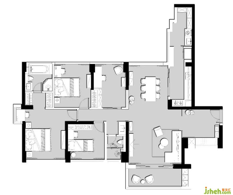 視覺均衡,是設(shè)計中經(jīng)常運用到的一種視覺規(guī)律。本案的設(shè)計是更好的為居住者打造出一個舒適的居住環(huán)境,在空間整體結(jié)構(gòu)相對合理的情況下,設(shè)計師通過細(xì)節(jié)對房子結(jié)構(gòu)上進行調(diào)整,以達到視覺上的均衡。室內(nèi)設(shè)計師