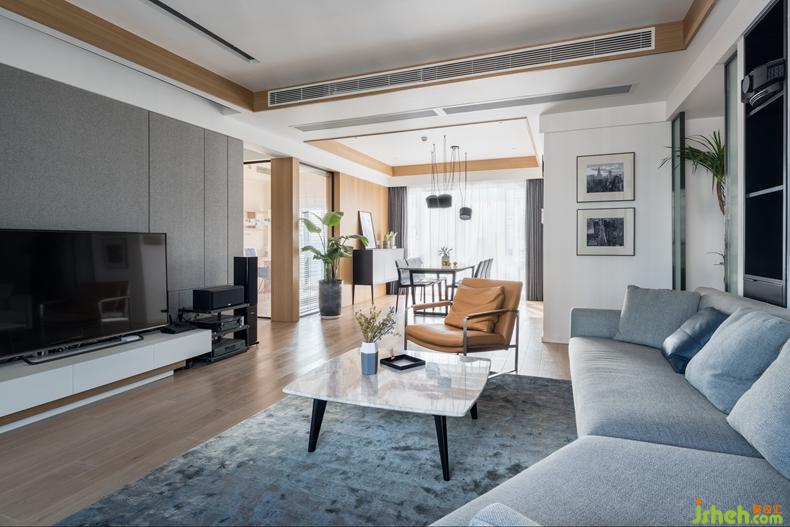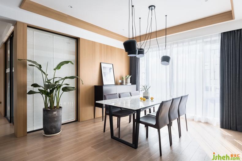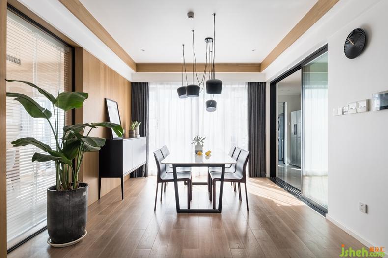玄關(guān)處黑框玻璃的設(shè)置使客廳在視覺上有了延長和開闊的效果,原木色系的KD飾面板也在無形中劃分了餐廳與客廳的區(qū)域,層次遞進。