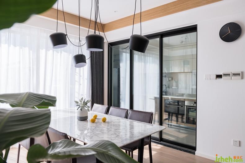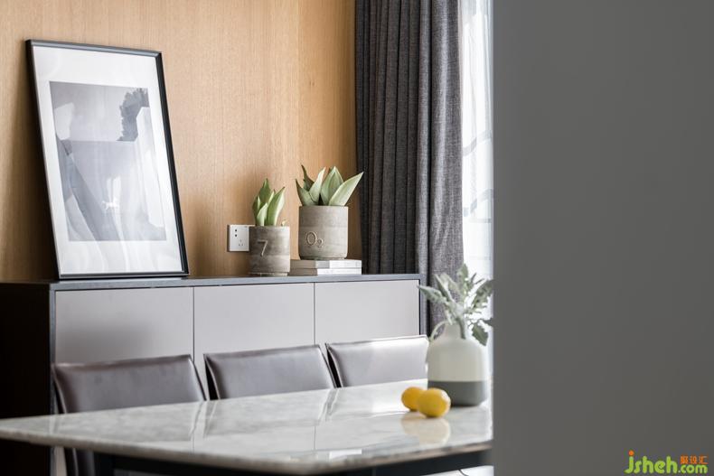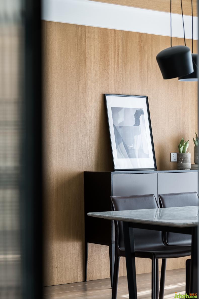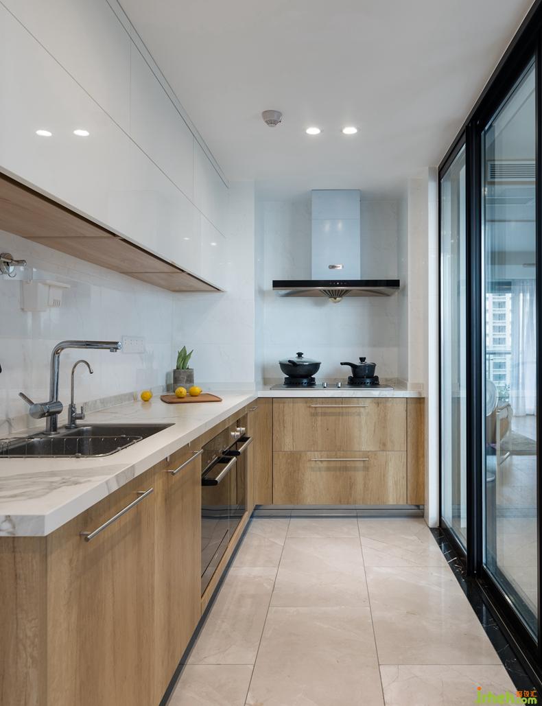 大理石臺面與木紋櫥柜相嵌相融。室內(nèi)設計師