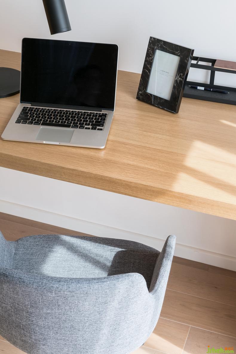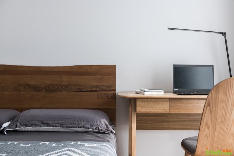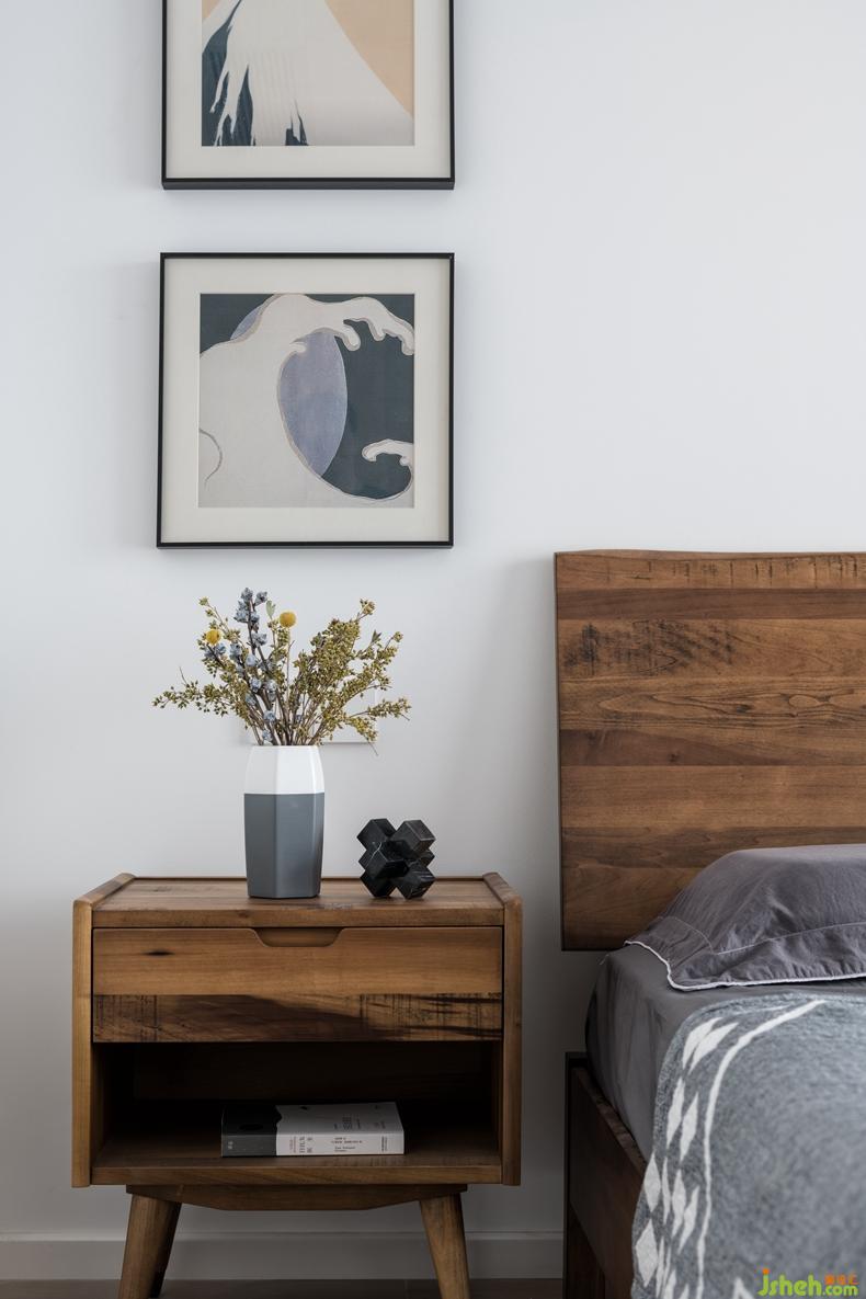 一般情況下,壁畫的懸掛位置于床頭正中間對應(yīng)的墻壁上。但設(shè)計(jì)師為了使空間達(dá)到視覺上的均衡,結(jié)合了書桌與倒凸窗的距離,在床頭柜的上方懸掛了兩幅精心挑選的小壁畫持恒。壁畫框采用黑色包邊在突顯質(zhì)感的同時(shí)對空間的整體效果上也起到了沉淀的作用。