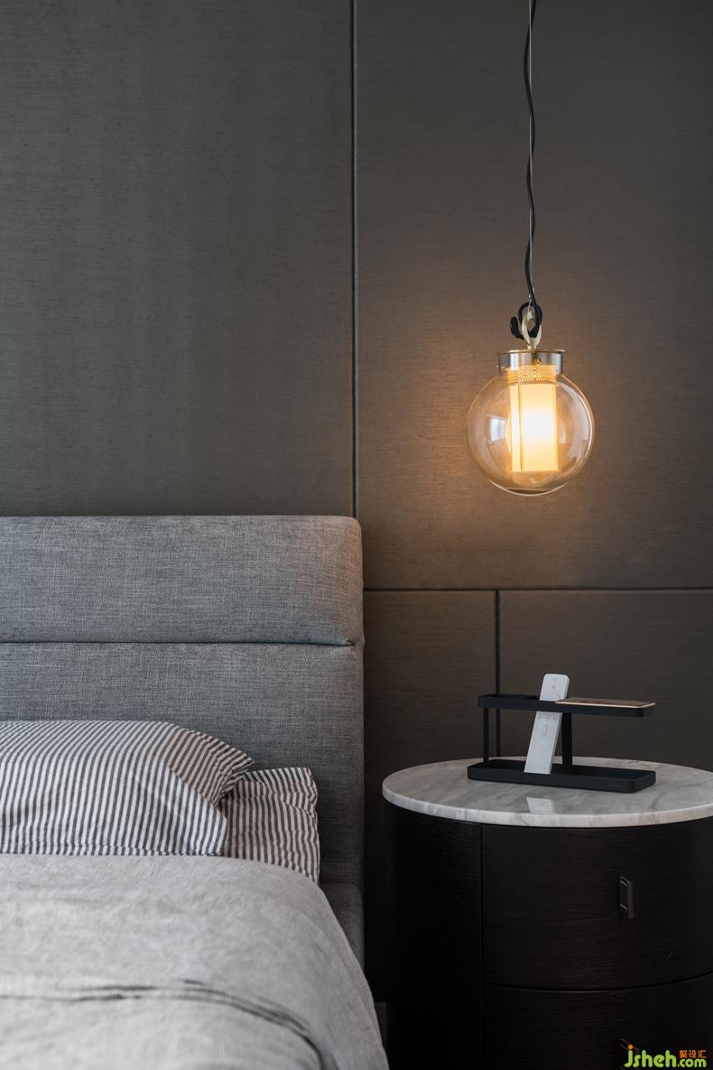在生活習(xí)慣上,靠近門邊通行頻繁區(qū)域的床頭柜采用了圓柱體的形狀避免磕碰。在視覺效果上,利用大理石臺面來提高整個(gè)空間的明亮度。