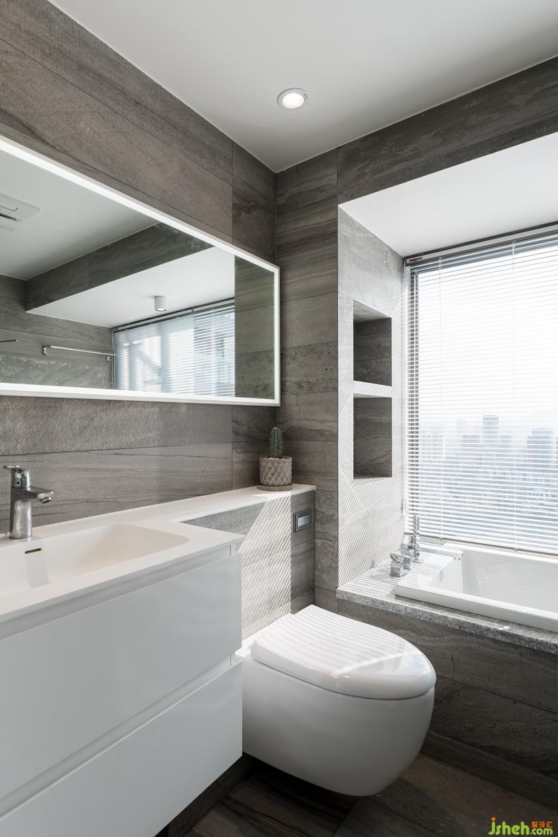主衛(wèi):壁鏡的白框設(shè)計(jì)突顯出灰色壁磚的紋路及質(zhì)地。白與灰的搭配給人一種簡約中帶著現(xiàn)代氣息的高級感。