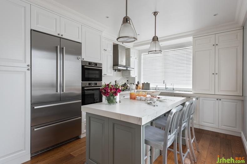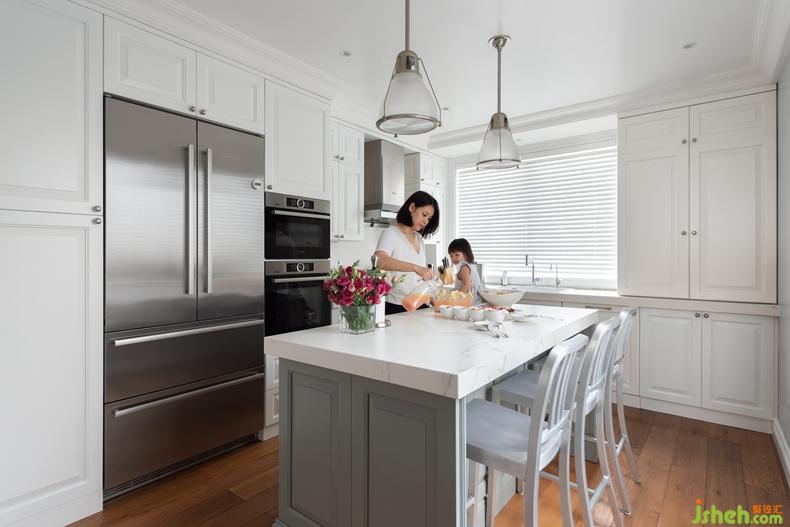 島臺(tái)大理石臺(tái)面與白色櫥柜交相呼應(yīng),這使廚房跟島臺(tái)不僅從視覺(jué)上是一個(gè)整體,也加強(qiáng)了二者的聯(lián)系。廚房在國(guó)外經(jīng)常是一家人交流最直接的地方,大人做飯,小孩寫作業(yè),島臺(tái)/餐桌對(duì)不同階段的人有著不同的功能,但有一個(gè)共同點(diǎn),便是拉近了一家人的交流。