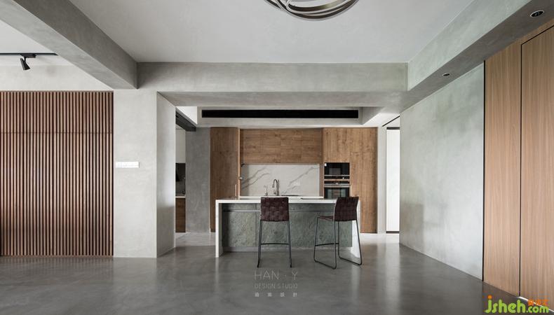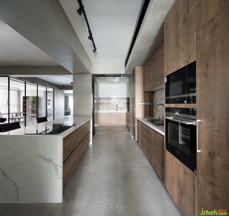 大片的木色與島臺(tái)的白色強(qiáng)烈對(duì)比,增強(qiáng)空間立體感。內(nèi)斂附有層次的木紋和純凈明亮的白色大理石,分別作為灶臺(tái)區(qū)/收納區(qū) 還有島臺(tái)的主色調(diào),涇渭分明的大塊對(duì)比色,為廚房空間營造出生活的韻律感。