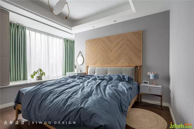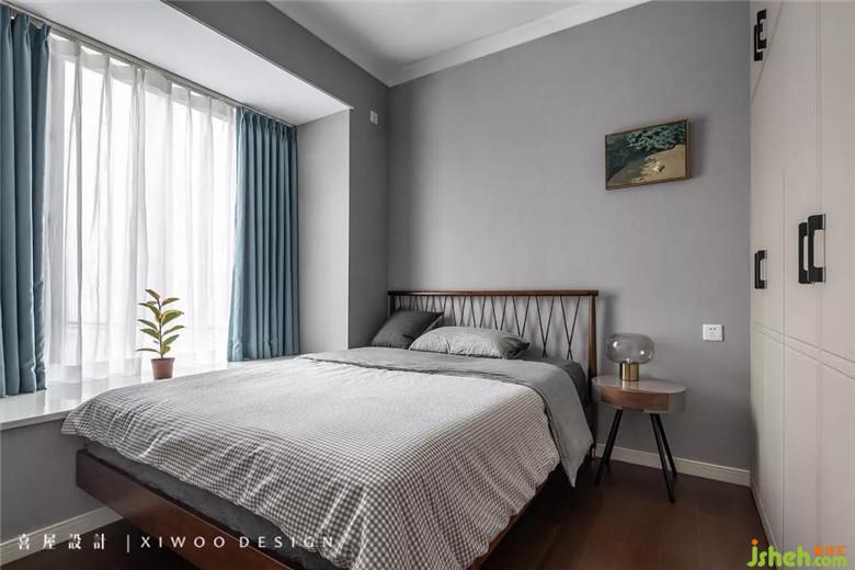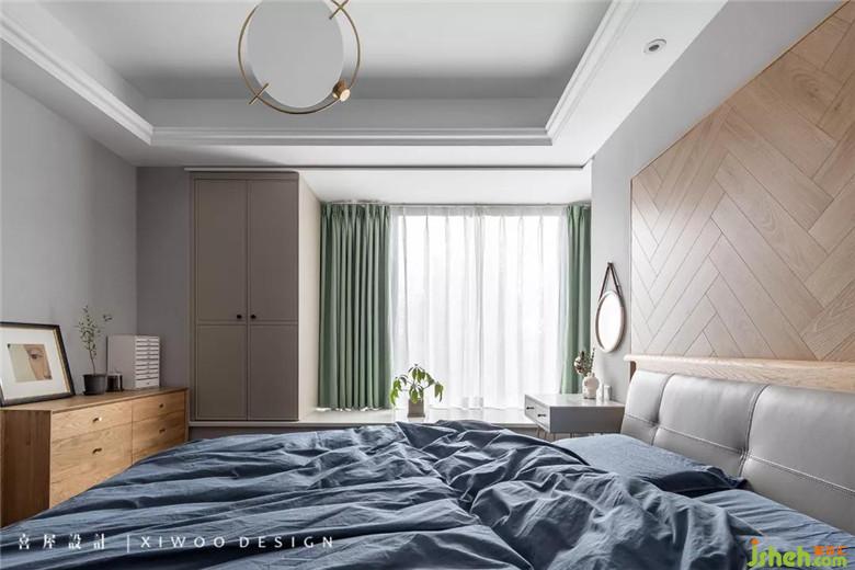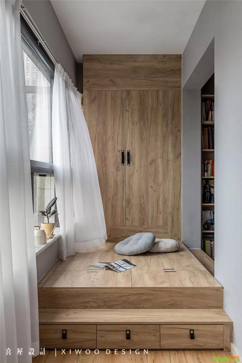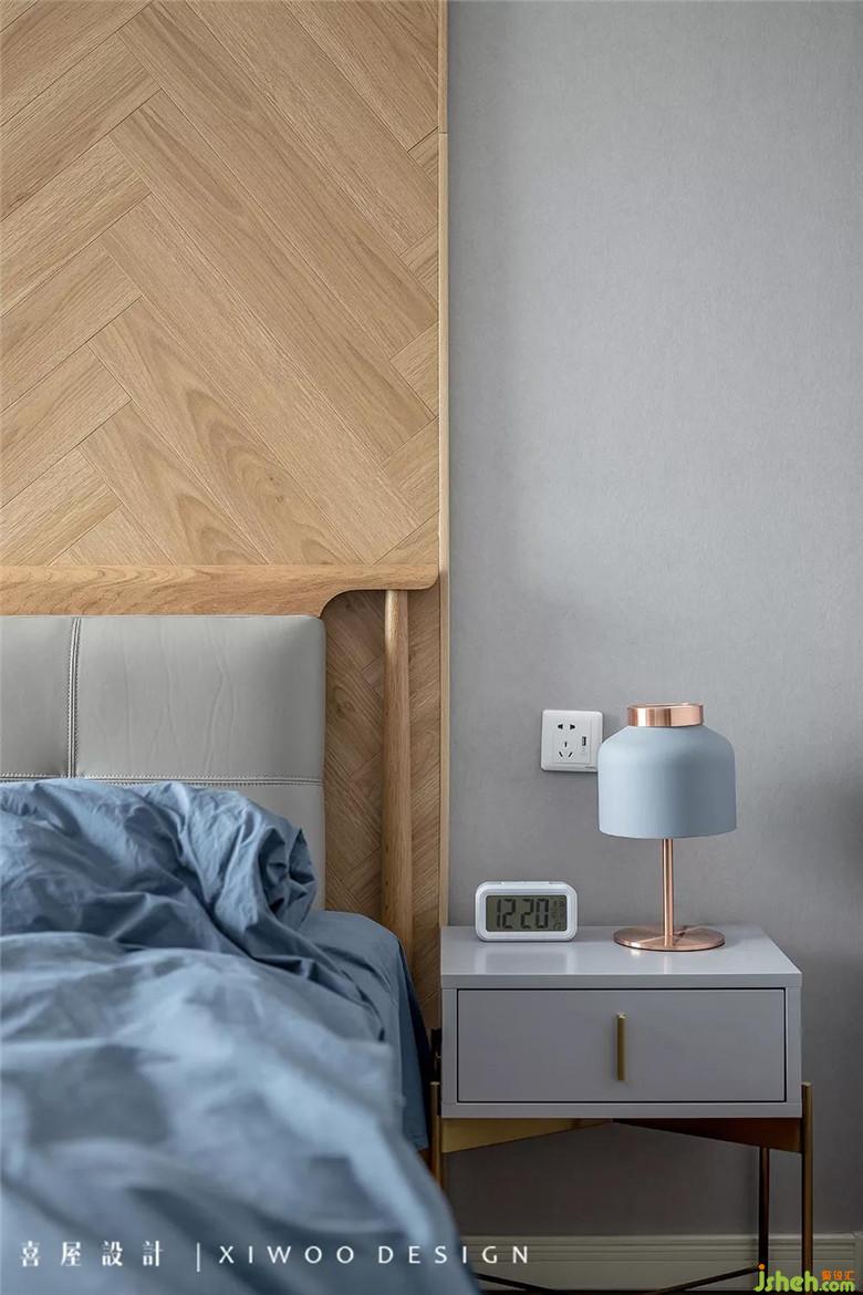 煙灰色的墻紙貫穿至主臥,搭配巧妙的木地板上墻設(shè)計(jì),渾然一體。