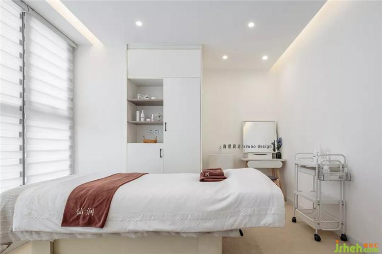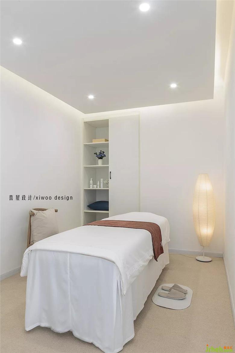 無主燈設(shè)計,再加燈帶的點綴,室內(nèi)設(shè)計師使空間氛圍柔美恬靜,更會給正在做皮膚SPA的顧客更為舒心的環(huán)境和享受。儲物柜既可以展示自己的產(chǎn)品,又可以放置顧客的衣物等。