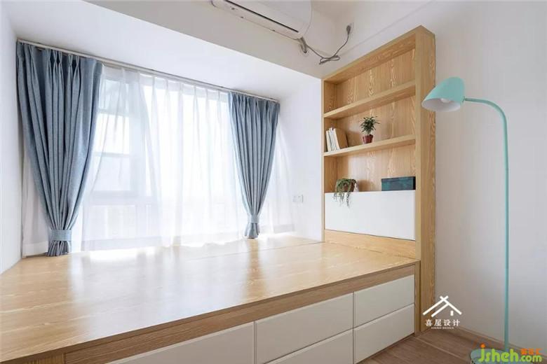 次臥室沿著飄窗做出來1.5米的榻榻米,利用原墻體空缺的地方做了隔板柜,相當(dāng)于床頭柜的功能可以放一些隨手小物,而這些小物件的擺放,可以讓整體變得活絡(luò)起來。
