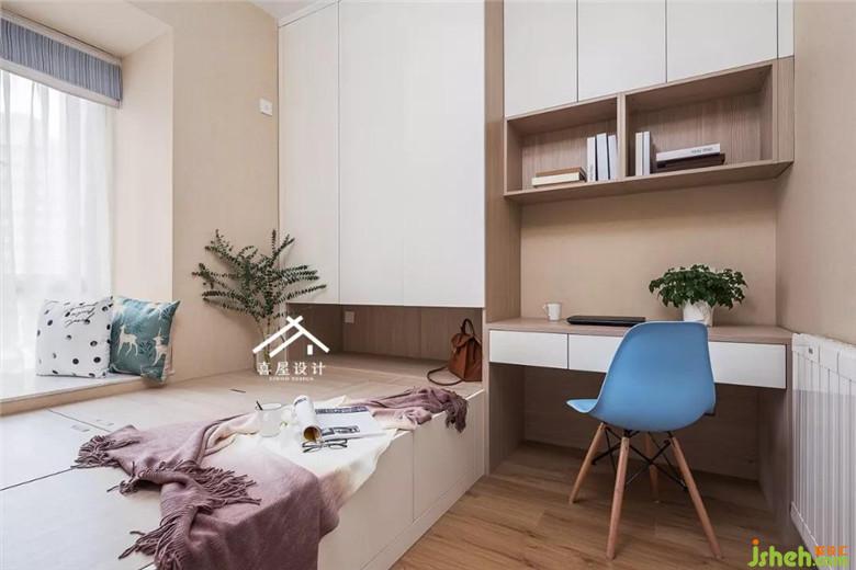 室內(nèi)設(shè)計師在次臥室做了榻榻米兼書房,榻榻米寬度1.5米,還剩下1.26米做了書桌,榻榻米側(cè)面做了抽屜,方便抽出來就可以儲物,榻榻米里面做了可以上掀門的儲物空間。