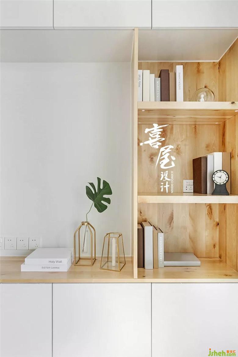 雙層實(shí)木隔板形成的書柜自然融入電視墻體,擺書擺裝飾品皆可,趣致協(xié)調(diào)。