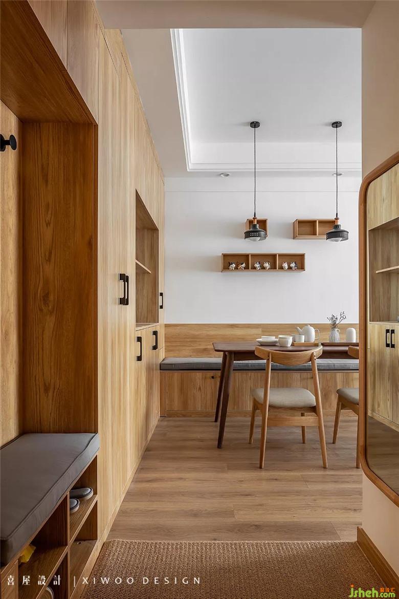 入戶門廳的換鞋凳,以“十字”隔板柜加坐墊的形式存在,放下幾雙常備鞋子,進進出出都是輕松舒適。
