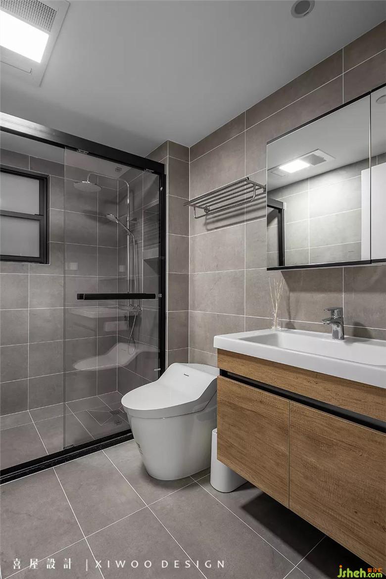 衛(wèi)生間舍去干濕分區(qū)的形式。多出120mm墻體寬度,以及嵌入式壁龕的加持,有效減輕視覺負(fù)擔(dān)并呈現(xiàn)出干凈整潔的視覺感受。