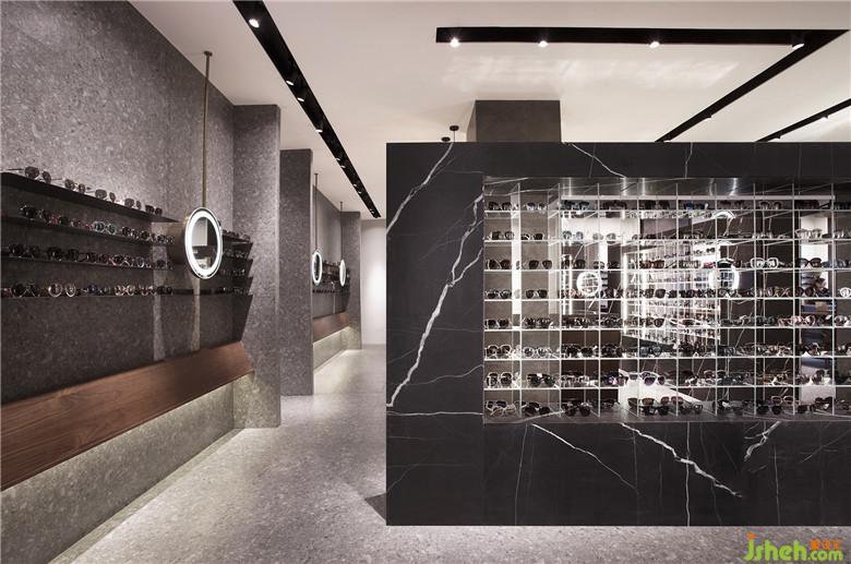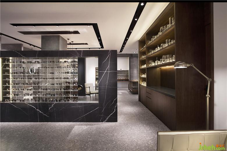 室內(nèi)設(shè)計師結(jié)合眼鏡的功能屬性抽離出幾種展示手法,固定墻面的黑鐵展架更好的襯托出眼鏡的主體地位,傳遞出陣列的美感。深色天然大理石和玻璃得組合更是暈染出一種精致優(yōu)雅的調(diào)性,金屬小車的造型不僅是對體塊的呼應(yīng),更給人帶來一種街頭售賣的感覺。