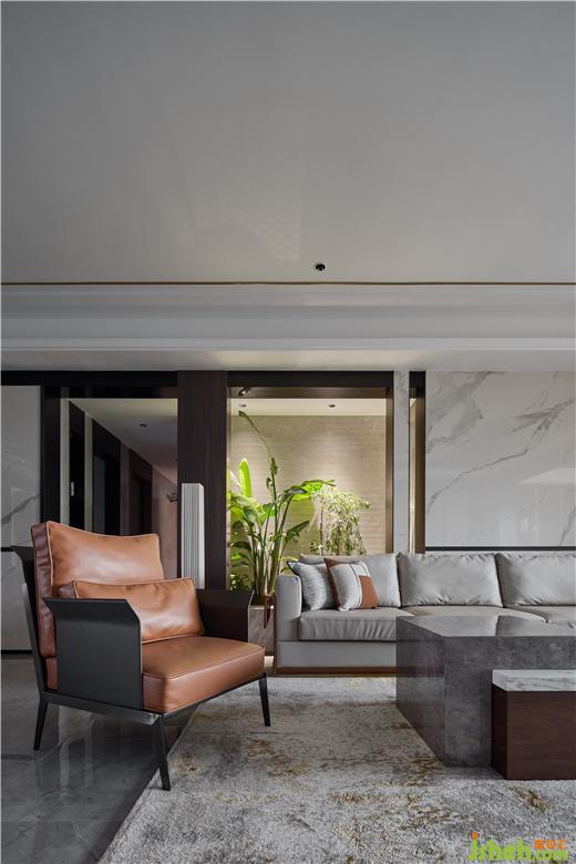 從平面布局就開始大膽突破傳統(tǒng)的家庭生活模式,讓出大部分空間給予公區(qū)接待。入戶玄關(guān)一面是實(shí)用儲(chǔ)物柜一面是藝術(shù)感實(shí)木畫,而隱形門的設(shè)置讓空間更有完整性。裝修設(shè)計(jì)透過玄關(guān)背景便可以窺探到沙發(fā)背景綠植區(qū),讓人忍不住想進(jìn)去一探究竟。