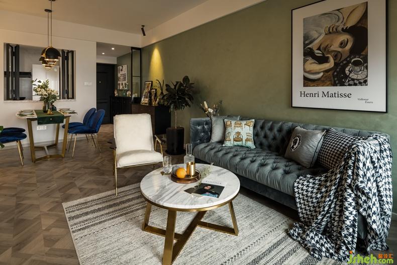 一面墻的尼絲絨綠搭配灰調的菱形復合地板提升了整個空間的復古感。