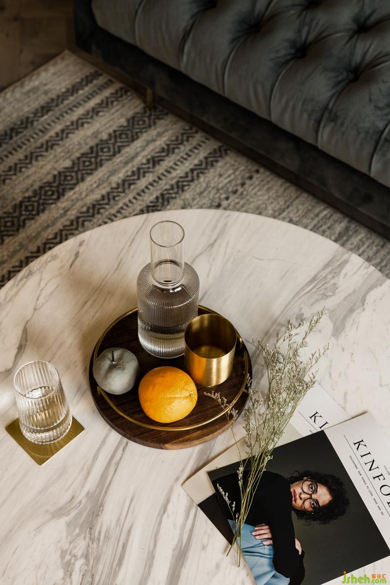 客廳色彩追求時尚且協(xié)調,大理石搭配金色元素組合的圓茶幾和北歐風地毯相結合,在整體風格中減輕了色彩飽和度,視覺空間隨之延伸。