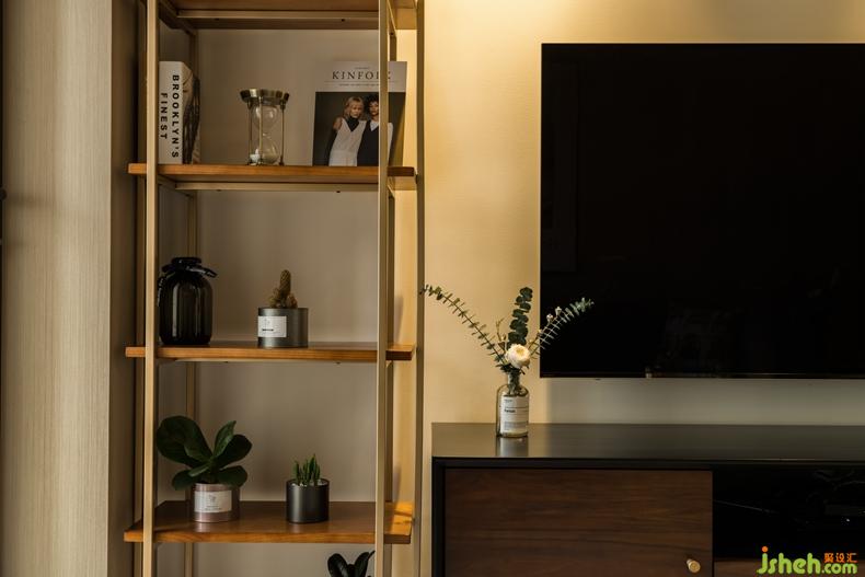 電視角落的置物架上放幾盆綠植,木調與簡約又不失貴氣金屬線條相互連結,將整個空間的精致和現代感完美的詮釋。