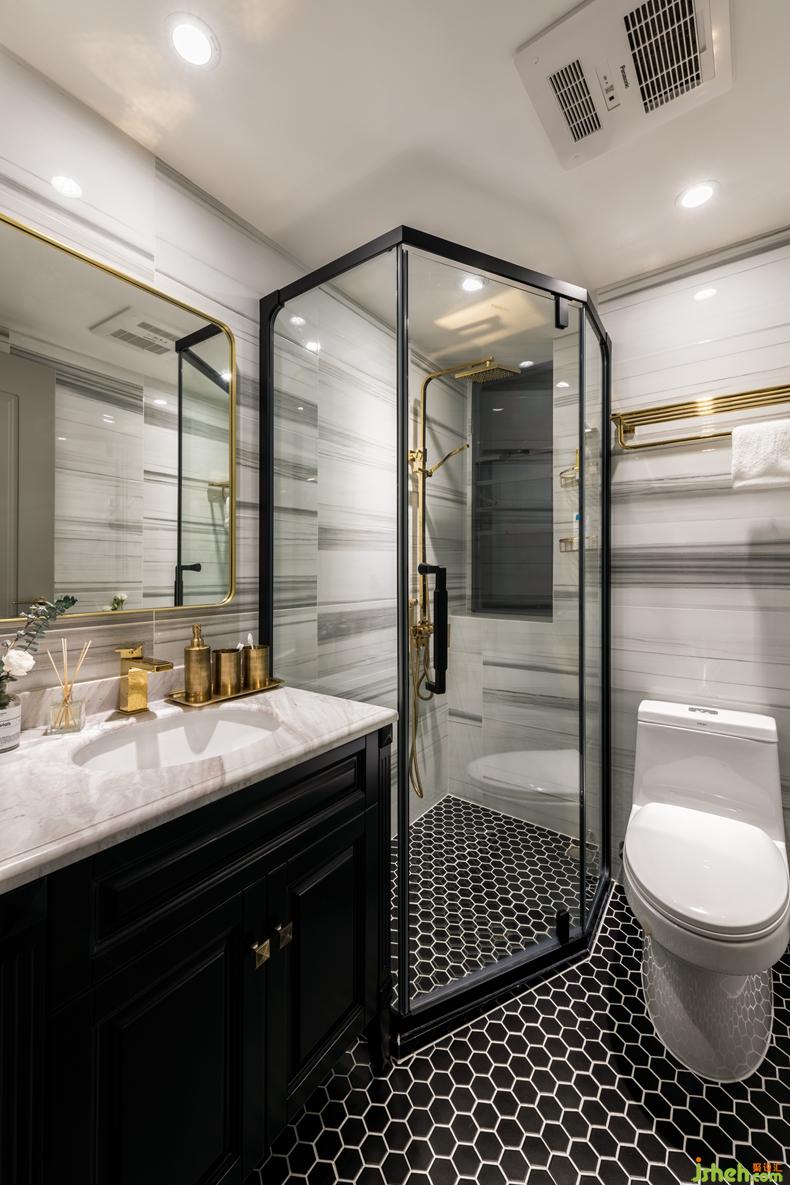 衛(wèi)生間無需花哨的裝飾。黑色的深沉,金色的高貴,黑金與大理石的搭配,碰撞出莊重而不失美感的線條美。深圳設(shè)計公司