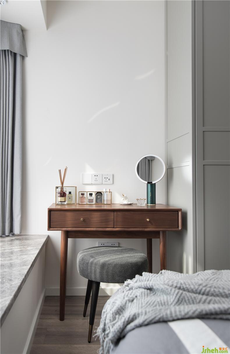 寧靜的灰色調(diào),搭配實木的化妝桌,平和、輕松而自然。木質(zhì)家具的搭配減少了灰色帶來的冰冷感,增添了溫柔的氣息。彌漫的幾縷陽光的映襯下,暖意倍增。