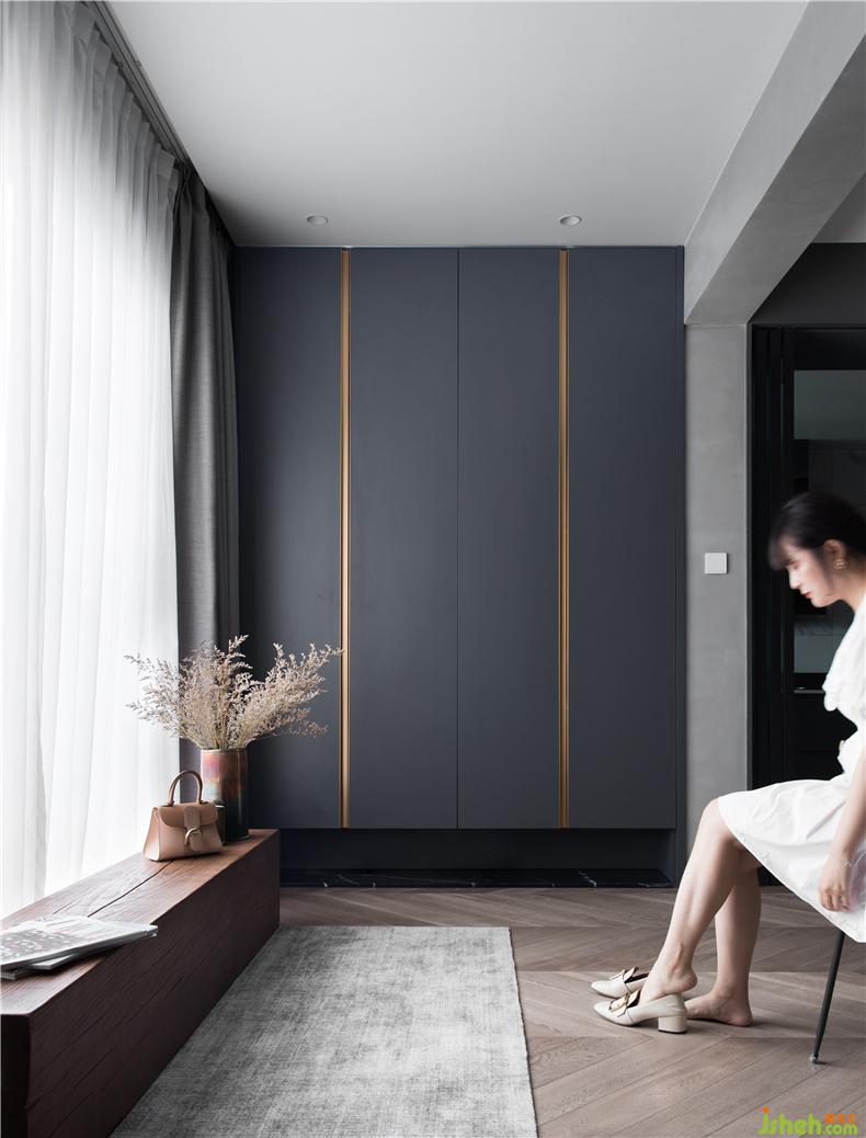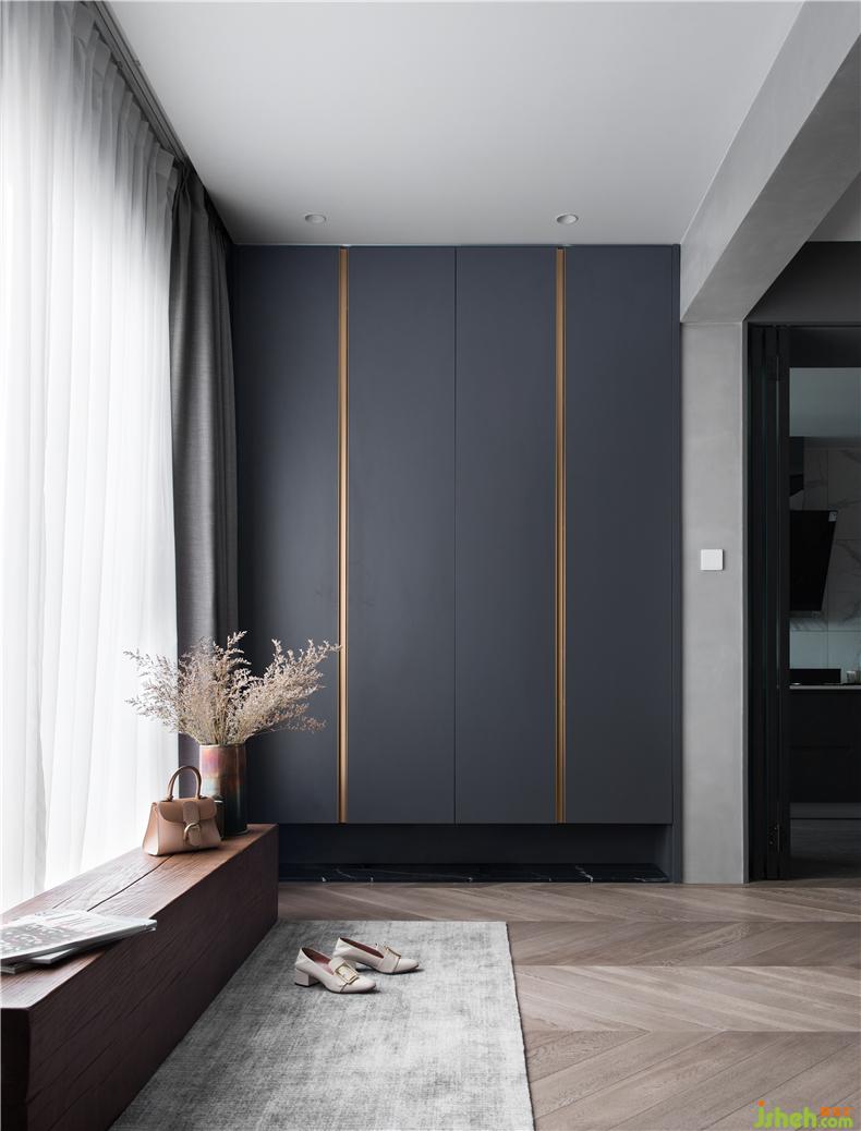 延伸性設(shè)計一門到頂?shù)男瘢酝瑯拥拈L度融入在柜門中的金屬把手,視覺上的美感,室內(nèi)設(shè)計師空間中的高級感。實木的長條木樁,它中和了冷冷的灰調(diào),微微暖化了空間的色彩,達到了一種平衡