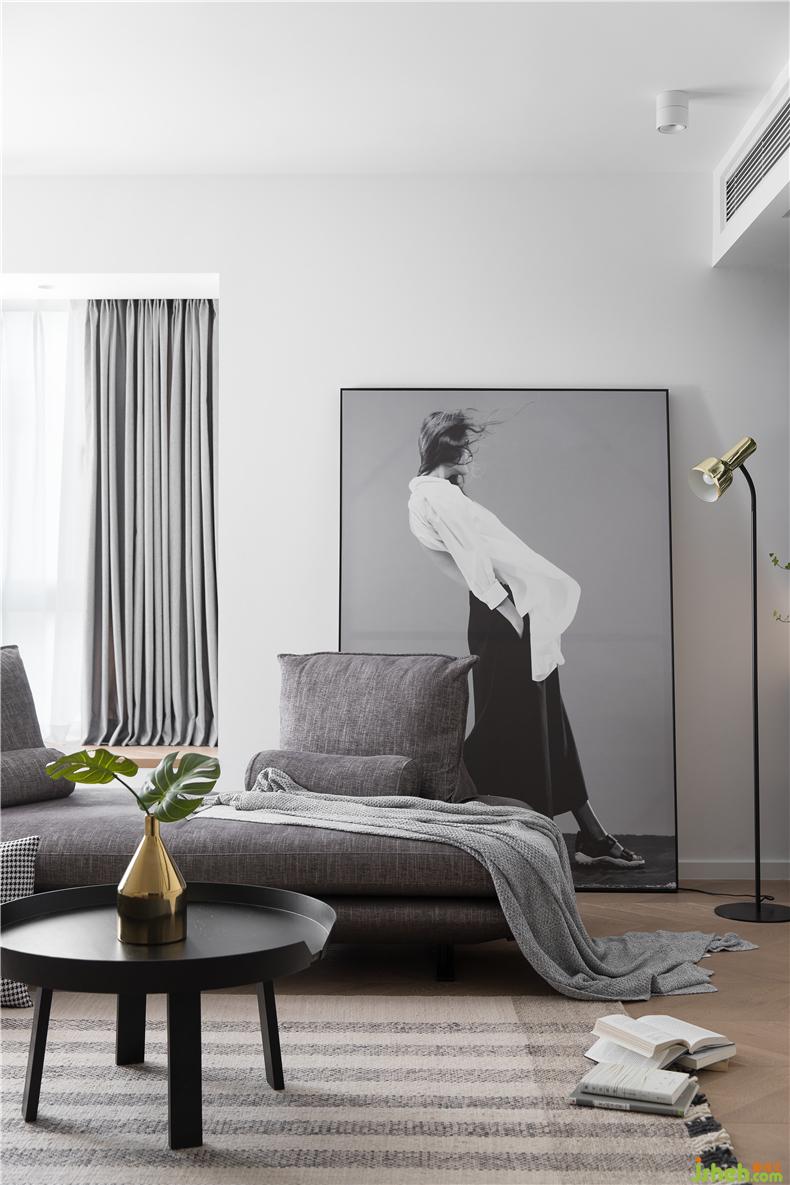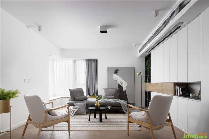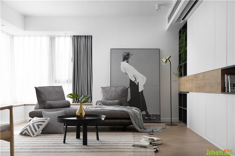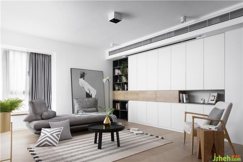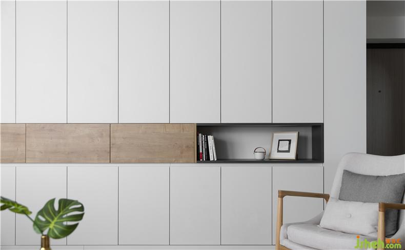 舍棄了電視墻,以投影幕布代替。一整面的無把手柜門,室內(nèi)設(shè)計師線條明了的一門到頂儲物柜,增加很多的儲物功能,視覺又簡潔干凈且提升家的高級感
