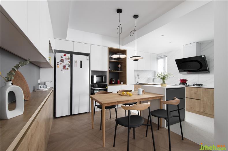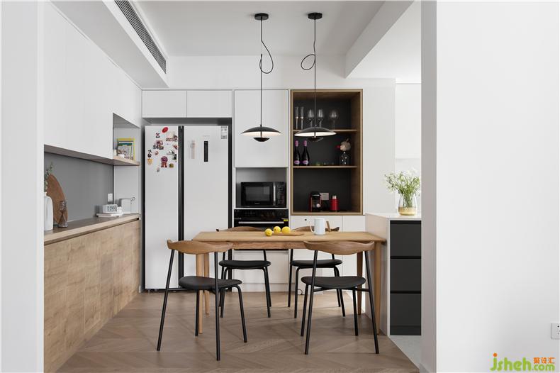 將餐廳與廚房的墻面打通,并將生活陽臺進行了封窗,巧妙的將開放式廚房與西廚與餐廳融合在一起,還是那么舒適。悄悄的從屋主本人了解到除了客廳,餐廳也是最喜歡待的一塊角落,經(jīng)常給自己泡個茶靜靜的待著,或者放臺筆記本,伴著鍵盤聲、鼠標(biāo)聲認(rèn)真的辦公室內(nèi)設(shè)計師