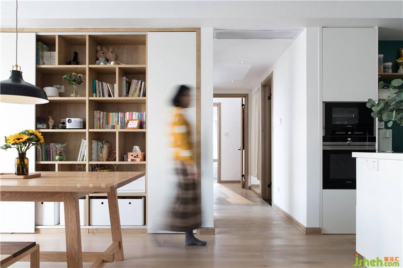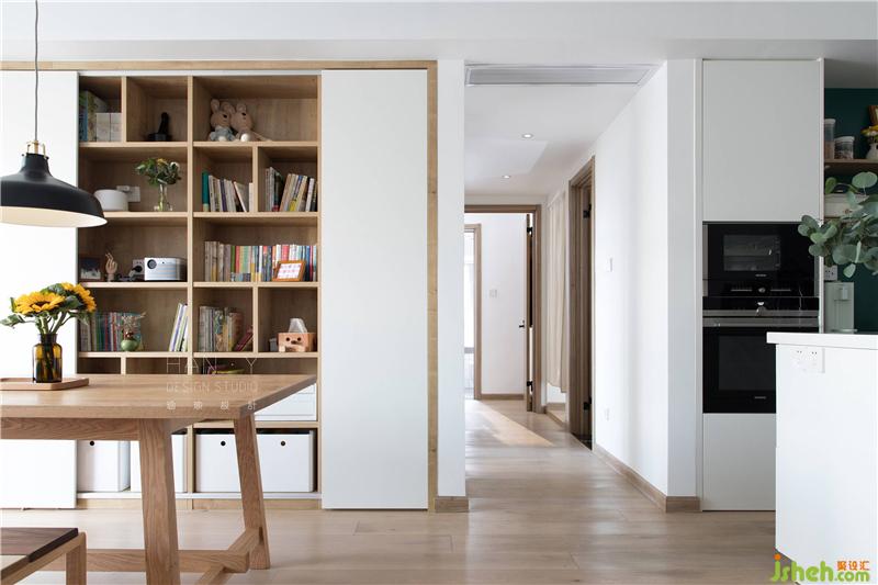 深圳室內(nèi)設(shè)計師將兩個陽臺都封起來,擴(kuò)大空間感。其中一個作為可封閉的中廚,外面設(shè)計了開放式西廚。每個房間都有一整面的收納儲物。為了給孩子營造讀書的氛圍,客廳移除電視墻,換成一整面書架,變成閱讀室。這個區(qū)域就這樣包含了用餐、閱讀、辦公、接待客人的多功能空間。