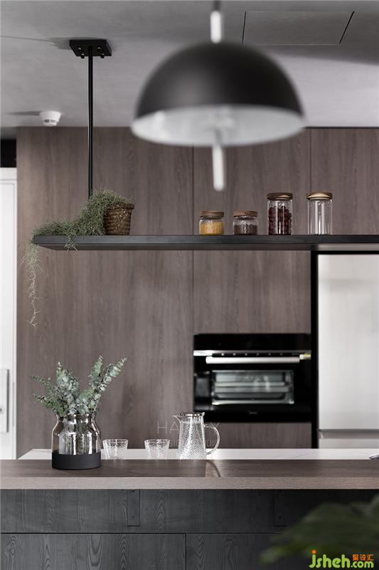 由于兩人都有喝咖啡的習(xí)慣,休閑時(shí)刻,男主會(huì)在島臺(tái)用咖啡機(jī)沖咖啡,女主則動(dòng)手做舒芙蕾松餅來(lái)進(jìn)行搭配。島臺(tái)上方設(shè)計(jì)的吊架,增添島臺(tái)的收納,也同時(shí)是操作時(shí)的照明燈。