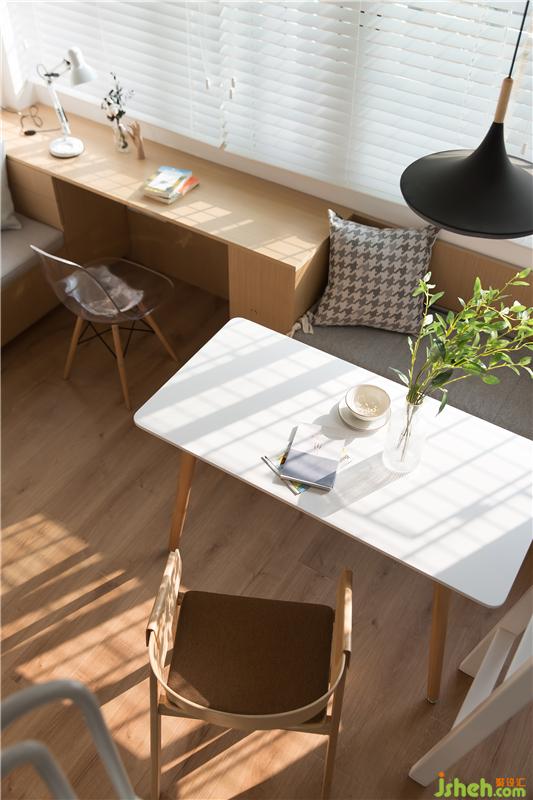 從走廊過(guò)來(lái)就是客廳與餐廳相連的空間,包括君君的學(xué)習(xí)區(qū)也在這個(gè)位置。經(jīng)過(guò)百葉簾的過(guò)濾,陽(yáng)光也成了家里自然唯美的裝飾。