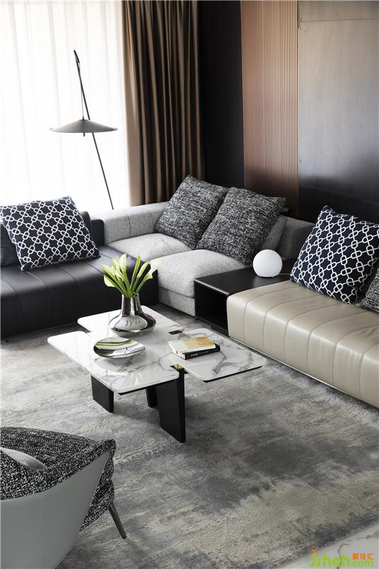 地面上魚(yú)肚白的純凈串聯(lián)生活的各個(gè)空間,通過(guò)經(jīng)典色調(diào)來(lái)呈現(xiàn)空間的比例感,開(kāi)放式設(shè)計(jì)延展了空間格局,木飾面板和巖板恰當(dāng)?shù)膮^(qū)分了空間的使用性。