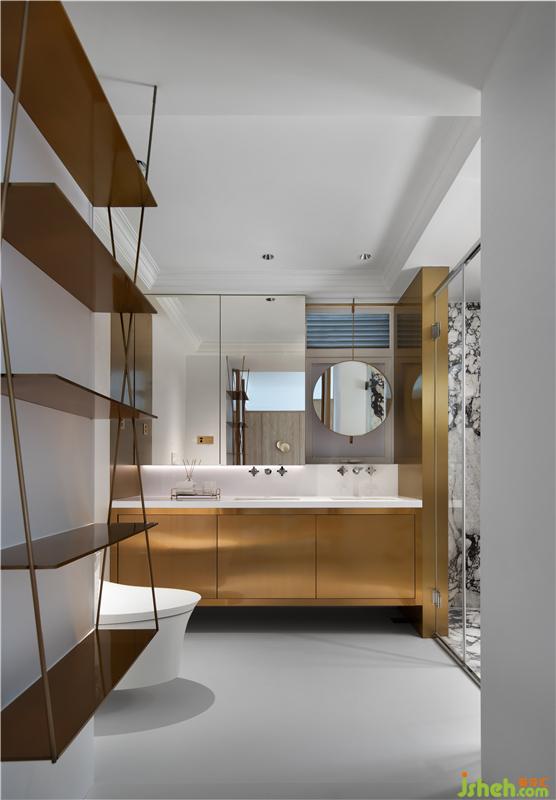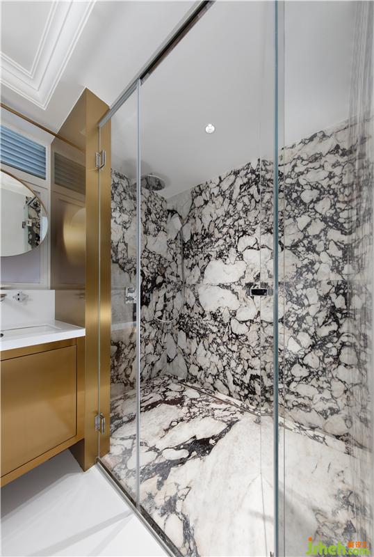 金屬與石材質(zhì)感的變化性,構(gòu)建出主衛(wèi)的層次感,雙臺(tái)盆的實(shí)用性更強(qiáng)。紋路大氣的大理石淋浴間,愈顯精致的貴族風(fēng)范。