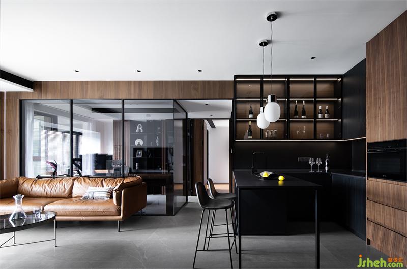 暗色系主題的家居設(shè)計(jì)語(yǔ)言搭配胡桃木色將空間兼蓄并收,營(yíng)造出睿智而低調(diào)的獨(dú)居氛圍感,一面酒柜、一方吧臺(tái),隱匿在黑白二元對(duì)立的酷感中,這是明亮空間里無(wú)法帶來(lái)的優(yōu)奢與神秘感……