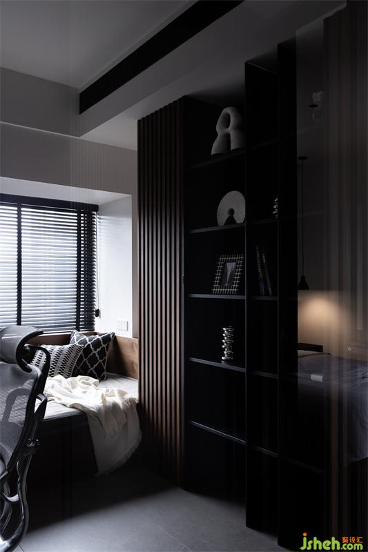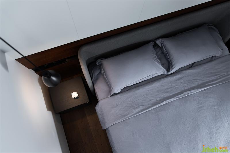 沉穩(wěn)貫通的氣質(zhì)浸染到睡眠區(qū),深黑的酷感轉(zhuǎn)化為裝點(diǎn),加上木質(zhì)的溫潤與灰色的深邃,達(dá)到一種波瀾不驚的平衡,白色木飾面板將身心放空,隨之而來的輕松氛圍使人心緒寧靜。