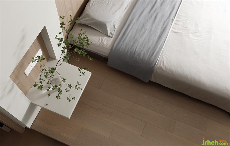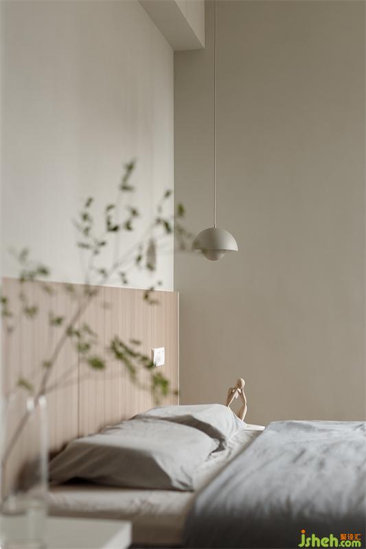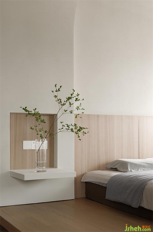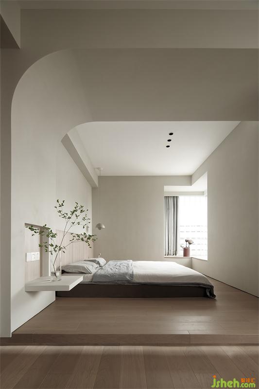 幾何的塊面、弧度在空間之中交錯、對比,達(dá)到美學(xué)平衡層面的曲直比例。利用地臺,營造一種”拾階而上”的安寢儀式感。