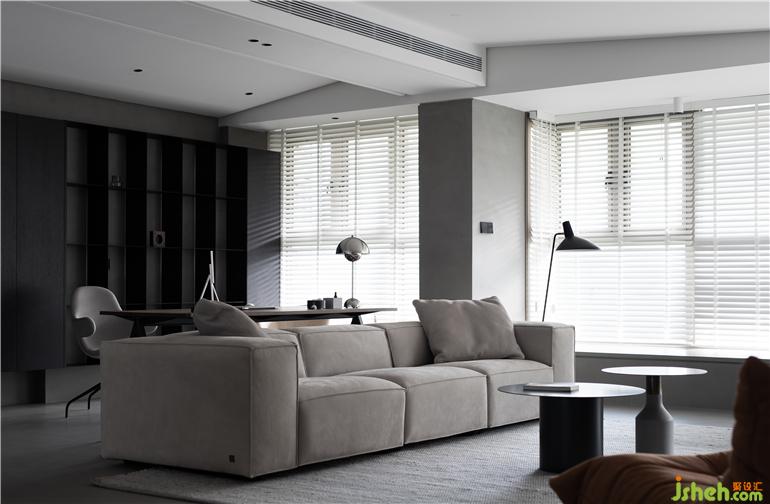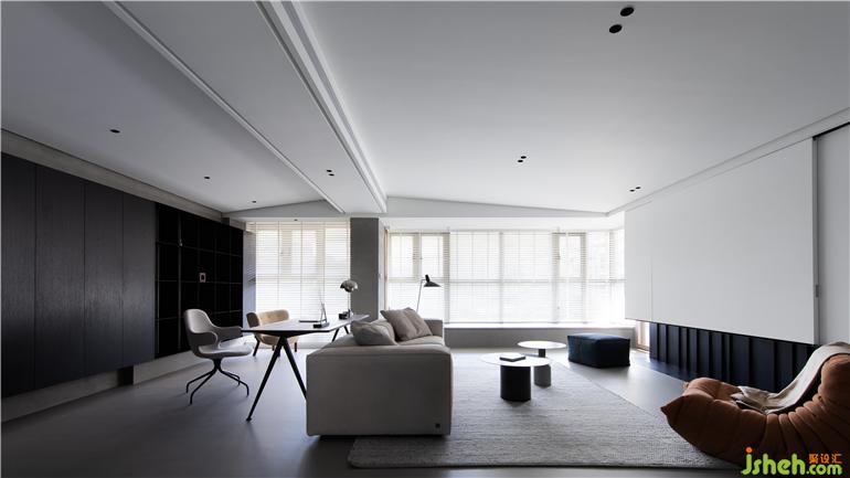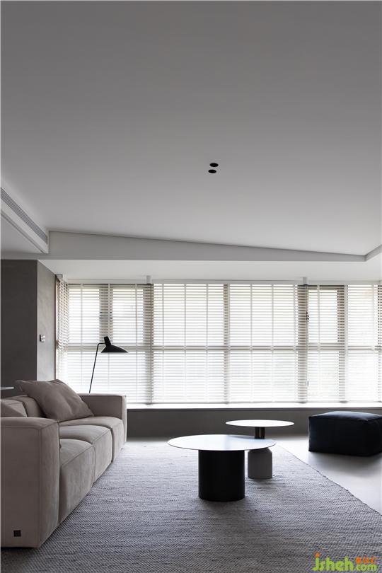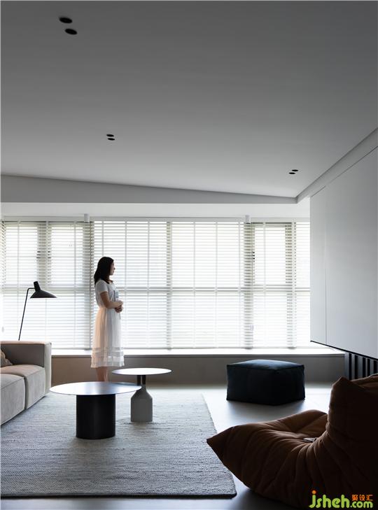 ① 將客廳與玄關(guān)區(qū)隔墻打通,打開后的客餐廳區(qū)域擁有良好的互動關(guān)系,暖灰色微水泥地面讓空間視覺表達統(tǒng)一有序。