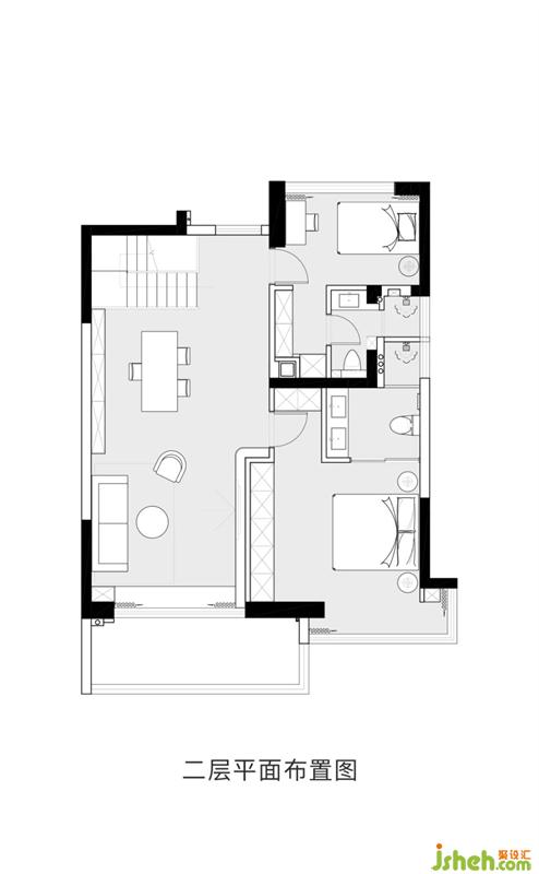 ③ 二樓改變了主臥門的位置,避免空間浪費(fèi),使公共區(qū)域更加方正。主衛(wèi)一側(cè)墻體做了內(nèi)移,設(shè)置雙洗手臺(tái),淋浴區(qū)借用兒童房衛(wèi)生間區(qū)域,利用窗戶達(dá)到很好的通風(fēng)效果。