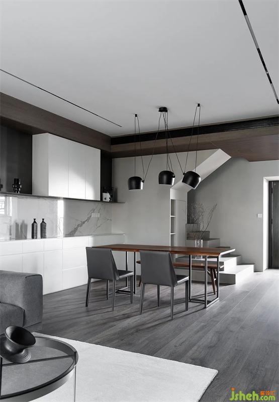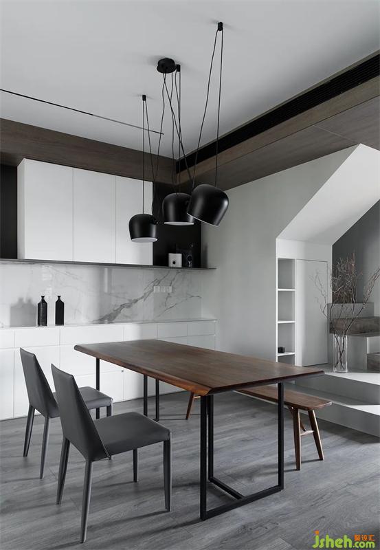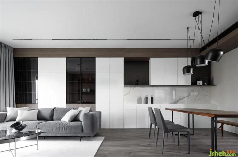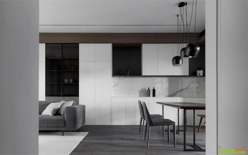 白色與木色的定制家具、大理石墻磚、黑色的鋼板、玻璃,以及素雅的胡桃木色,呈現(xiàn)出大氣脫俗的質(zhì)感。表面上看不到多余的物品,實(shí)則巧妙的藏在設(shè)計(jì)當(dāng)中。