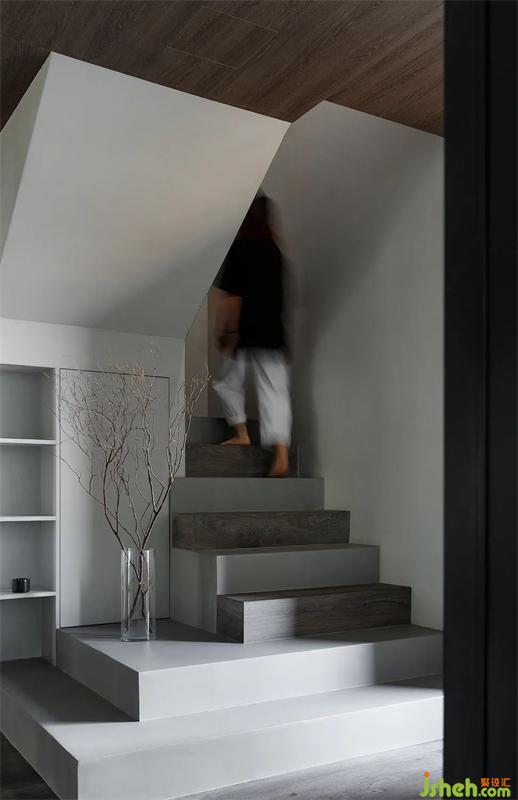 微水泥與木材的節(jié)奏穿插,樸拙雅致的干枝花藝,將腳步引向二樓。