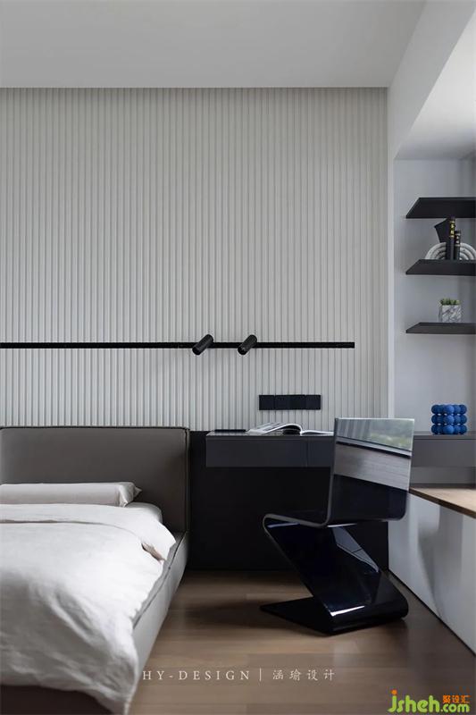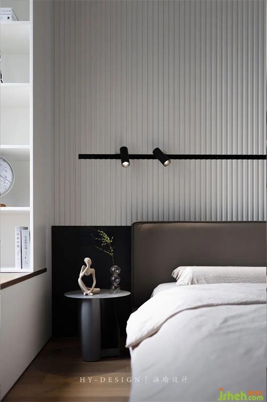 黑色護墻板+長城板,帶來層次感的同時豐富了空間線條。床頭可移動壁燈,貼合屋主睡前閱讀的習(xí)慣。