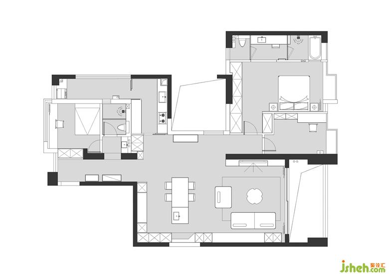 · 原戶型采光通風(fēng)良好,公共區(qū)域視野開闊。根據(jù)屋主需求,結(jié)構(gòu)上保留了原本的三個房間,在公共空間的處理上,空間功能沿著模糊化、多變性的方向發(fā)展。
