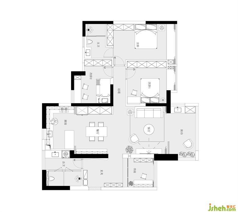 · 由于是老房裝修,現(xiàn)有格局無法滿足家庭五口人的入住需求,而生活場景的多義性已經(jīng)成為一種重要的生活方式,因此將入戶玄關(guān)左側(cè)的雜物間與生活陽臺一部分連通,家裝設(shè)計打造三分離公衛(wèi)和洗烘衣物區(qū)。右側(cè)劃分出多功能區(qū),日??僧斪銮俜?、書房、休閑區(qū)。
