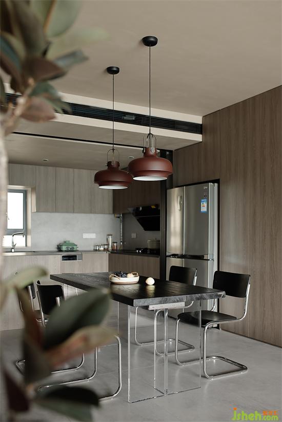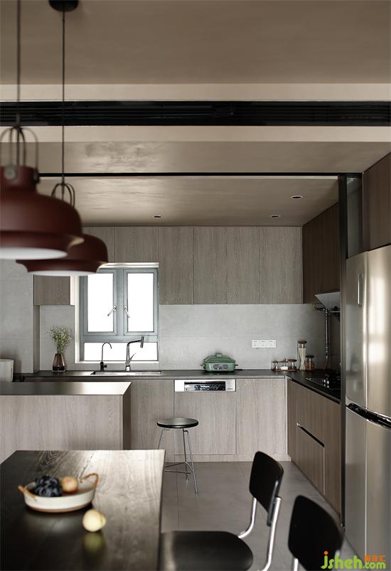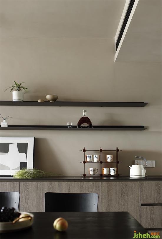 餐廚區(qū)沿著餐桌的洄游動(dòng)線依次鋪開(kāi),滿足日常家人間圍坐餐食,家裝設(shè)計(jì)利用玻璃推拉移門(mén),增設(shè)島臺(tái),形成靈活的中西廚開(kāi)放格局,功能上相得益彰,又與不遠(yuǎn)的客廳和諧共處。