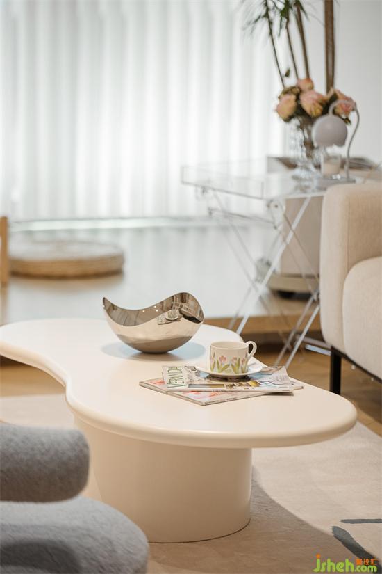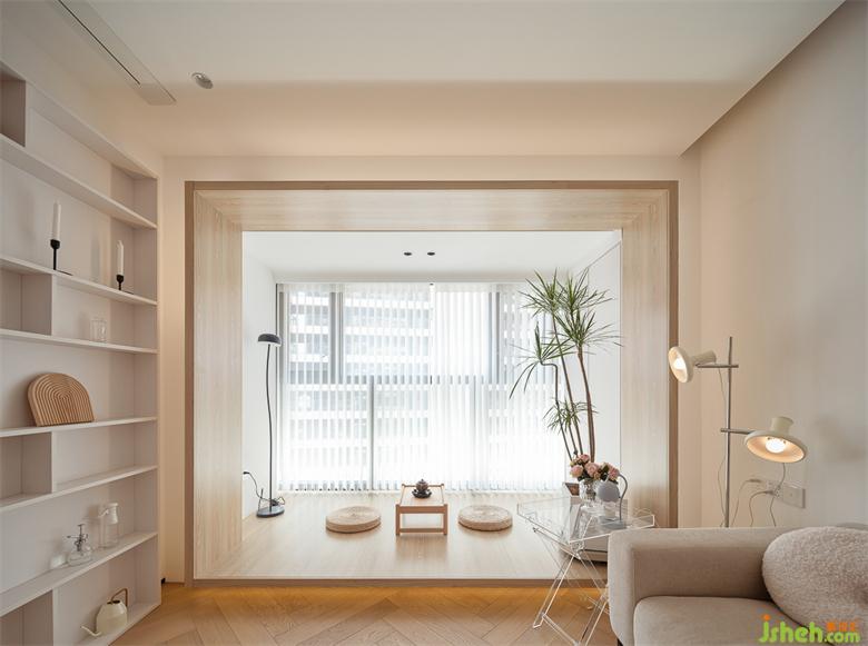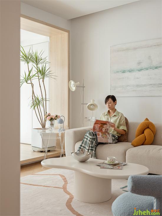 陽臺并入客廳,利用地臺做出休閑區(qū),6㎡的空間打造出一個健身區(qū)兼茶室,同時也擴大了空間視覺感。家裝設(shè)計平時女主經(jīng)常在這里健身做瑜伽,大面落地窗的優(yōu)勢,導(dǎo)入了充裕的光線,適宜的綠植點綴,把空間襯托的更鮮活,一旁的收納柜也可以收納大件的健身器材和孩子的玩具,沒有電視的客廳,為三口之家的生活提供了無限可能。